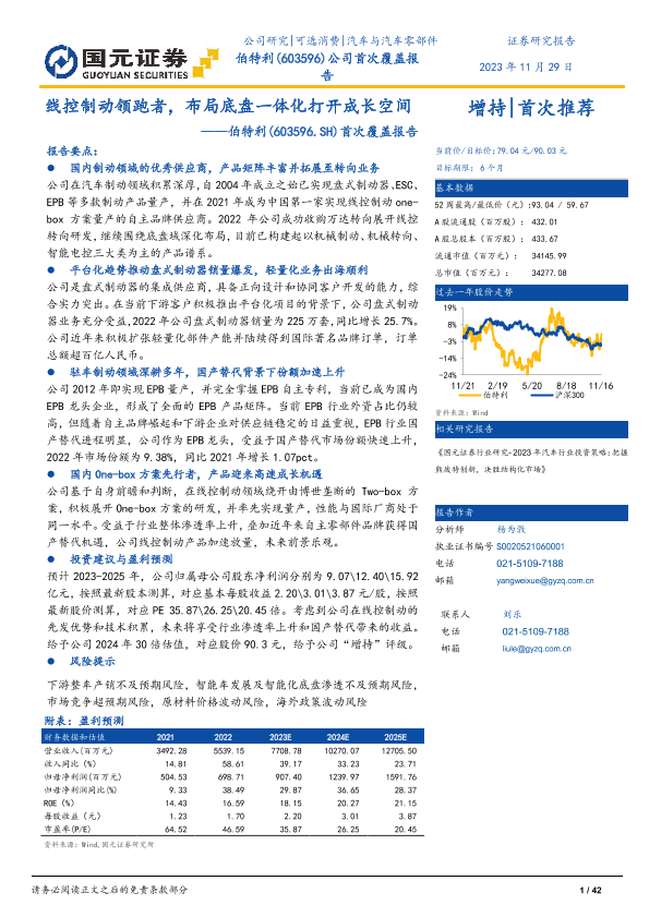 【国元证券】【20231129】线控制动领跑者,布局底盘一体化打开成长空间——伯特利(603596.SH)首次覆盖报告-42页
