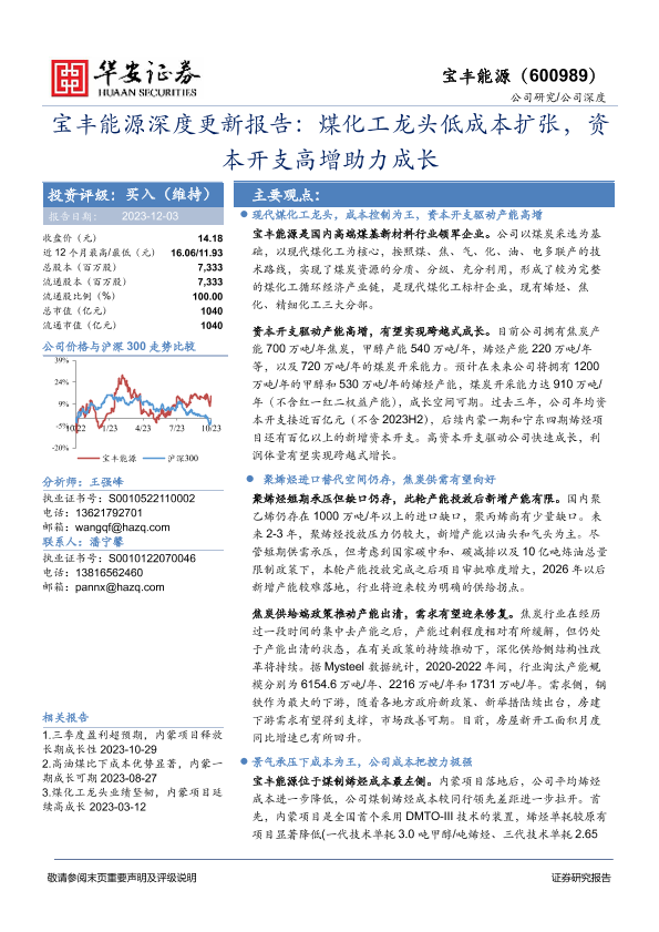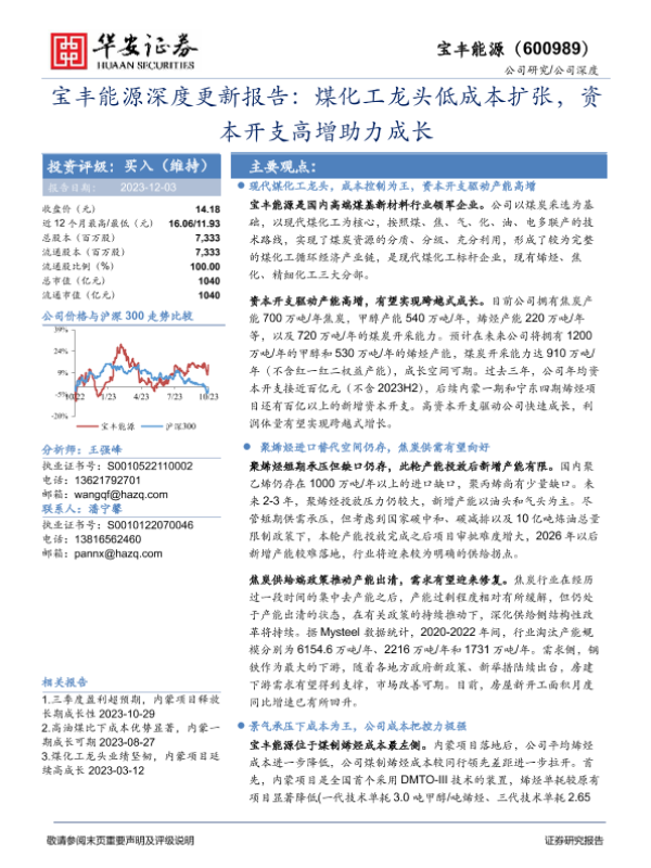 【华安证券】【20231203】宝丰能源深度更新报告:煤化工龙头低成本扩张,资本开支高增助力成长-34页