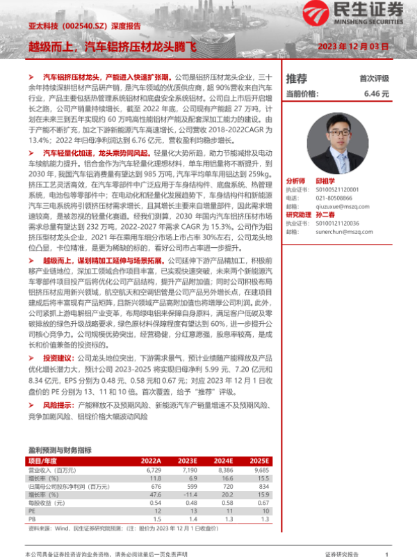 【民生证券】【20231203】20231203-民生证券-亚太科技-002540.SZ-深度报告:越级而上,汽车铝挤压材龙头腾飞-41页