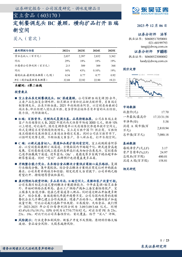 【东吴证券】【20231206】宝立食品-603170.SH-定制餐调龙头BC兼顾,横向扩品打开B端新空间-23页
