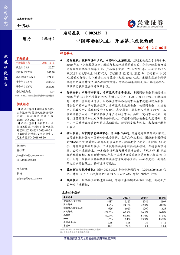 中国移动 启明星辰 增资扩股 第二成长曲线 网络安全