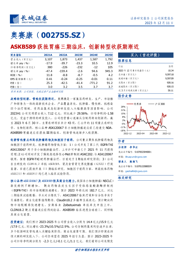 【长城证券】【20231211】奥赛康-ASKB589获批胃癌三期临床,创新转型收获期渐近-24页