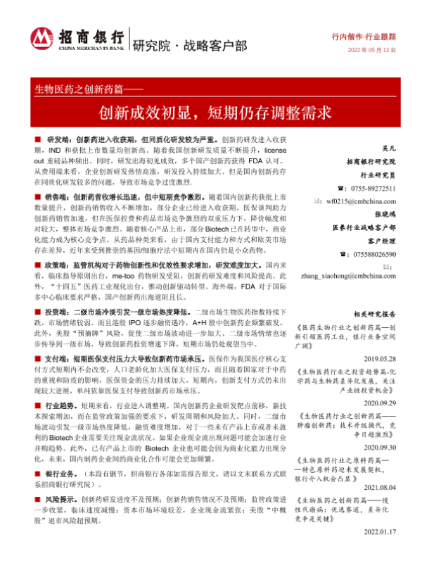 【招商银行】【20220512】生物医药行业之创新药篇:创新成效初显,短期仍存调整需求-22页