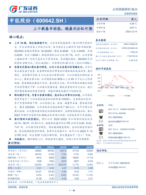 新能源 火电业务 申能股份 电力行业 盈利预测