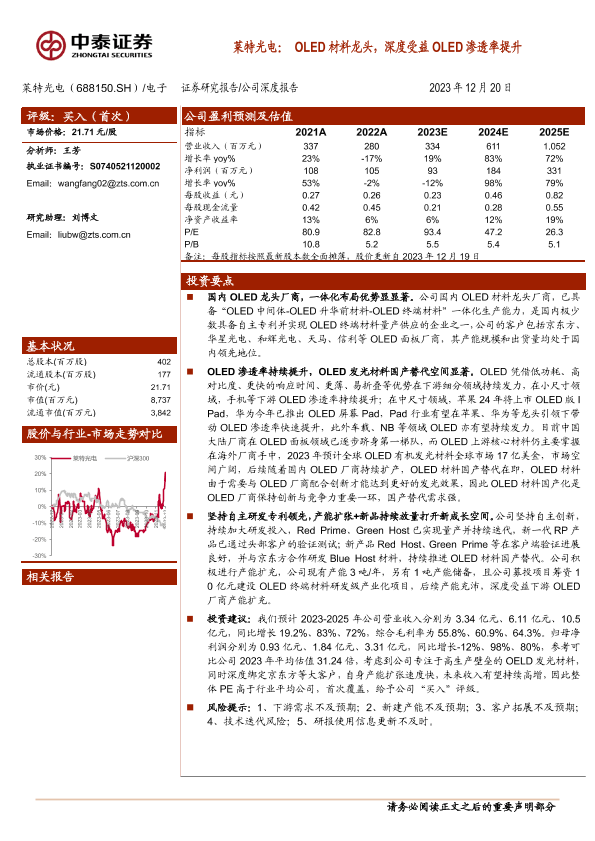 【中泰证券】【20231220】莱特光电:OLED材料龙头,深度受益OLED渗透率提升-33页