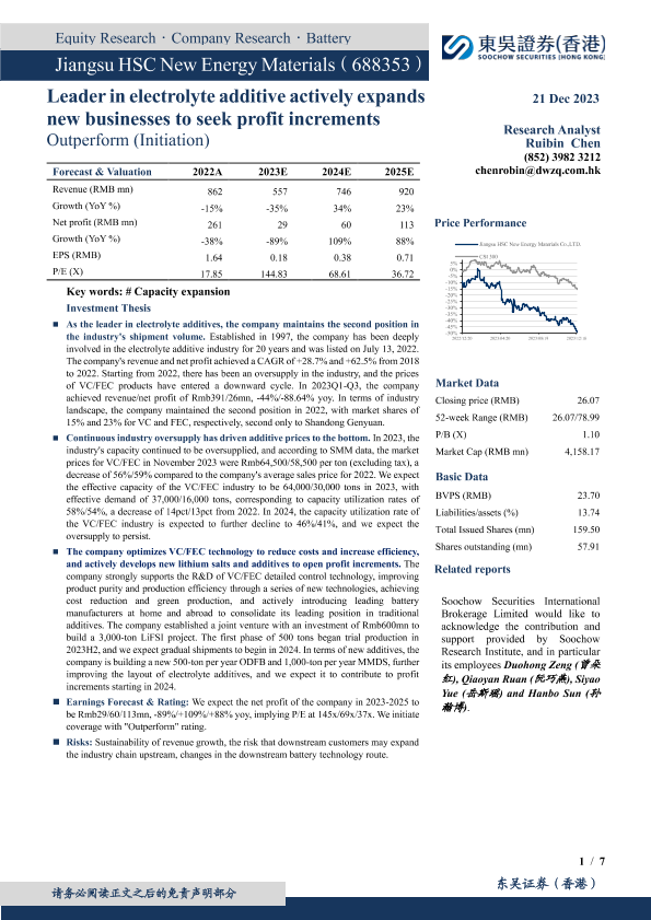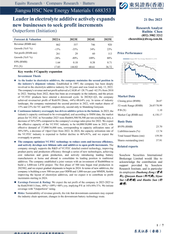【东吴证券(香港)】【20231221】电解液添加剂龙头,积极布局新业务寻找盈利增量-7页