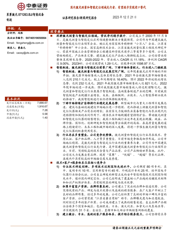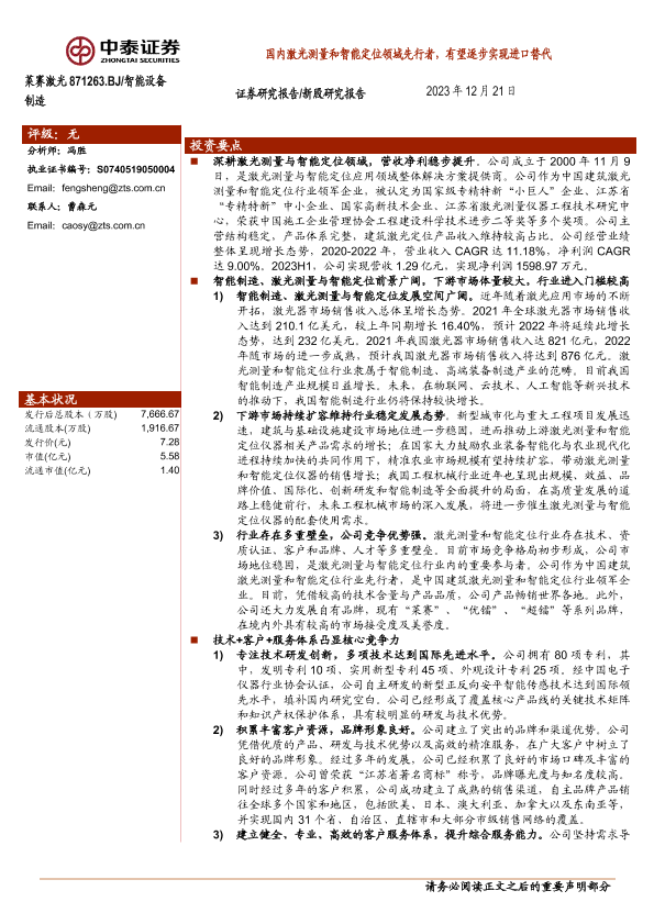 【中泰证券】【20231221】国内激光测量和智能定位领域先行者,有望逐步实现进口替代-22页