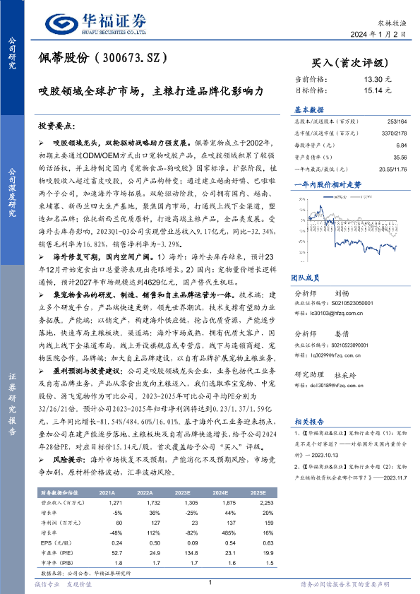 【华福证券】【20240102】佩蒂股份(300673.SZ)咬胶领域全球扩市场,主粮打造品牌化影响力-27页