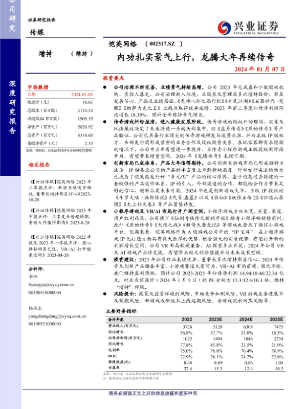 AI探索 VR布局 恺英网络 游戏行业 证券分析