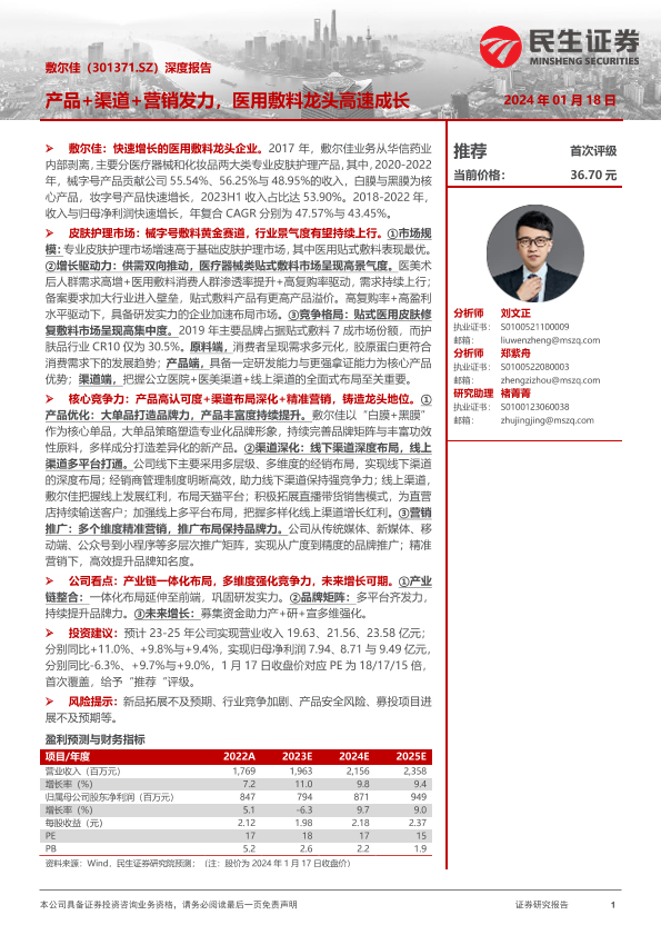 【民生证券】【20240118】20240118-民生证券-敷尔佳-301371.SZ-深度报告:产品+渠道+营销发力,医用敷料龙头高速成长-40页