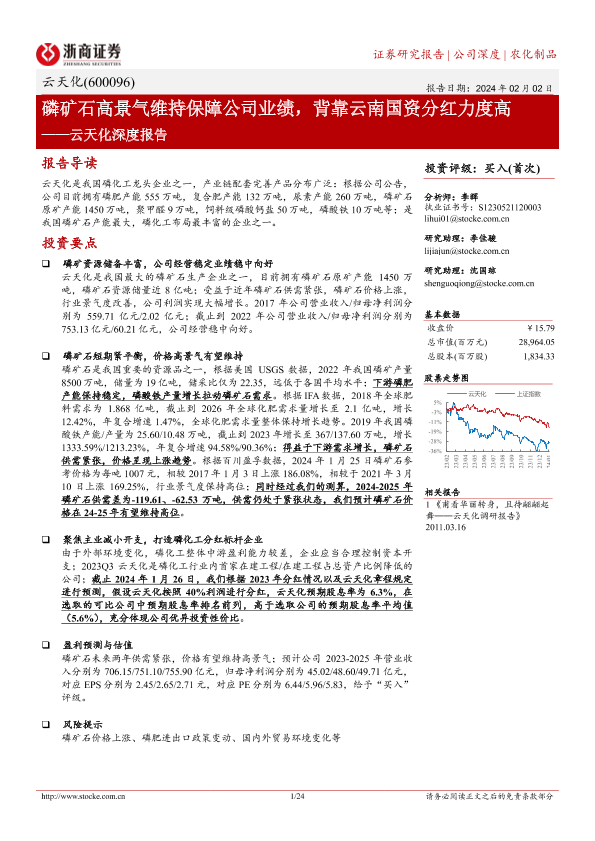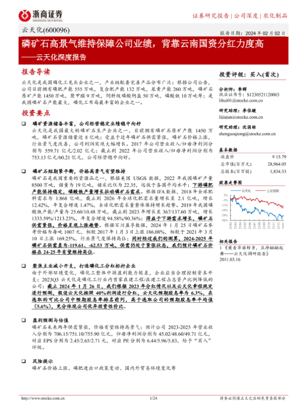 【浙商证券】【20240202】云天化深度报告:磷矿石高景气维持保障公司业绩,背靠云南国资分红力度高-24页