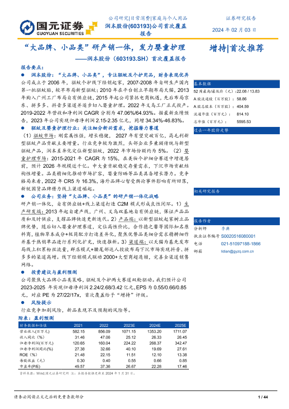 【国元证券】【20240203】“大品牌、小品类”研产销一体,发力婴童护理——润本股份(603193.SH)首次覆盖报告-44页