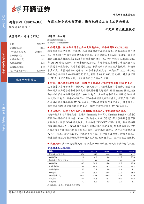 【开源证券】【20240208】北交所首次覆盖报告:智慧生活小家电领军者,厨师机新品及自主品牌为看点-30页