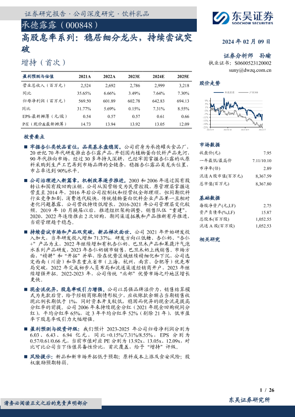 市场拓展 杏仁露 财务管理 饮料行业 高股息率