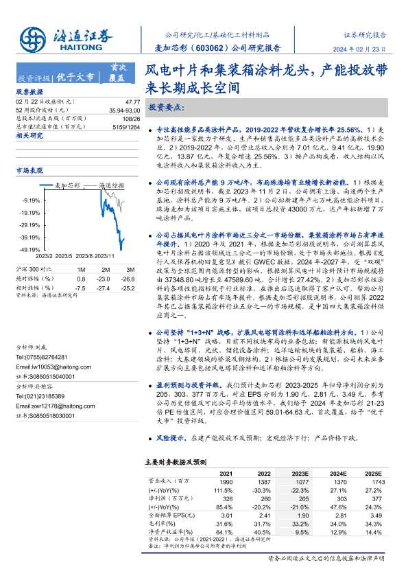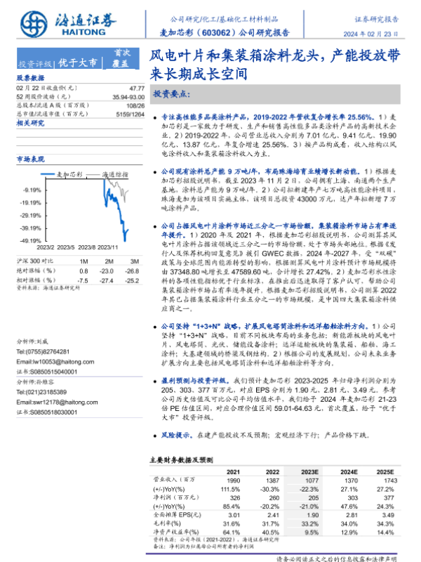 【海通证券】【20240223】麦加芯彩-风电叶片和集装箱涂料龙头,产能投放带来长期成长空间-22页