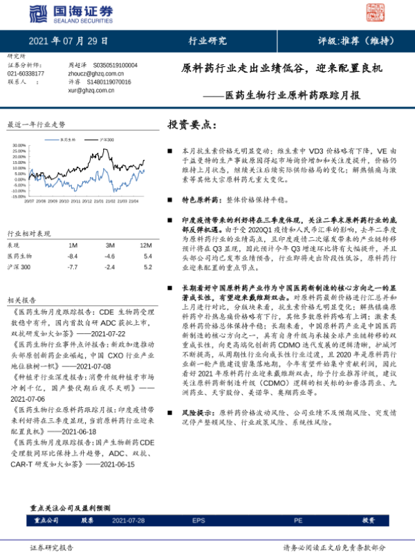 【国海证券】【20210729】医药生物行业原料药跟踪月报:原料药行业走出业绩低谷,迎来配置良机-15页
