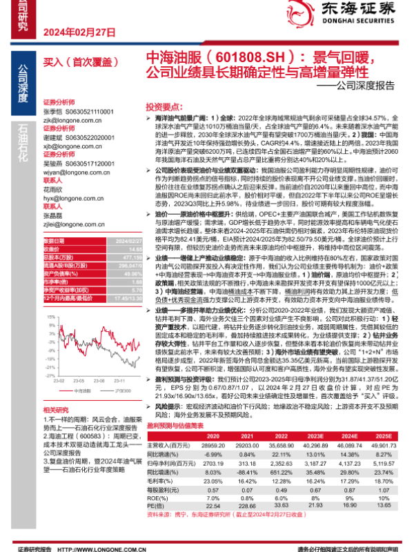 【东海证券】【20240227】中海油服(601808.SH):景气回暖,公司业绩具长期确定性与高增量弹性——公司深度报告-37页