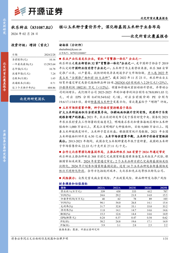 【开源证券】【20240228】北交所首次覆盖报告:核心玉米种子量价齐升,深化转基因玉米种子业务布局-31页