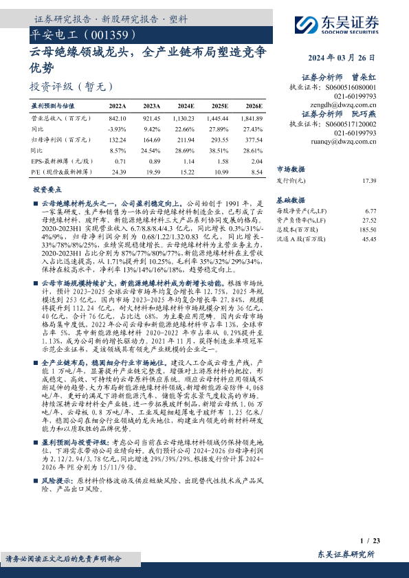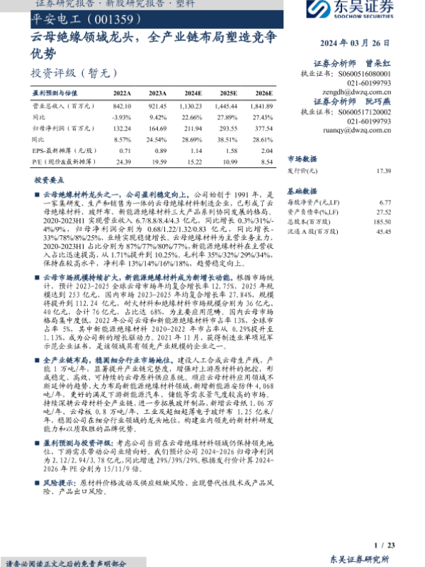 【东吴证券】【20240326】平安电工-云母绝缘领域龙头,全产业链布局塑造竞争优势-23页
