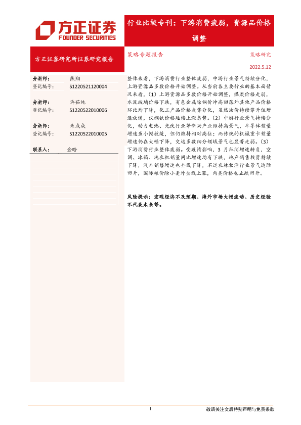 【方正证券】【20220512】行业比较专刊:下游消费疲弱,资源品价格调整-19页