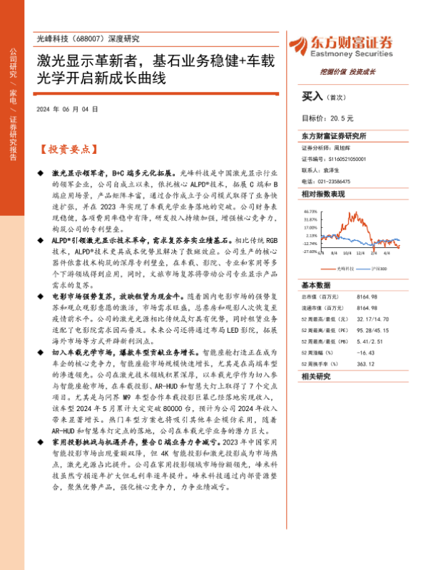 【东方财富证券】【20240604】光峰科技-688007.SH-深度研究:激光显示革新者,基石业务稳健+车载光学开启新成长曲线-32页