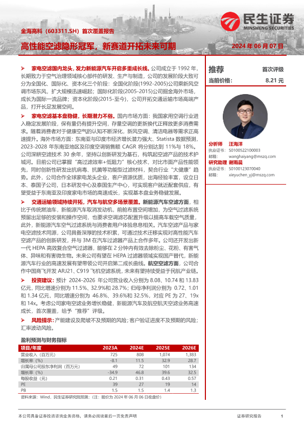 【民生证券】【20240607】金海高科-603311.SH-首次覆盖报告:高性能空滤隐形冠军,新赛道开拓未来可期-35页