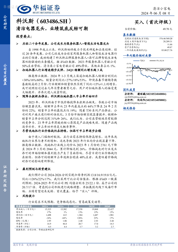 【华福证券】【20240608】科沃斯(603486.SH):清洁电器龙头,业绩筑底反转可期-10页
