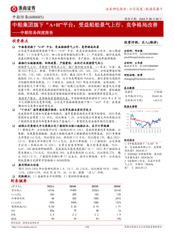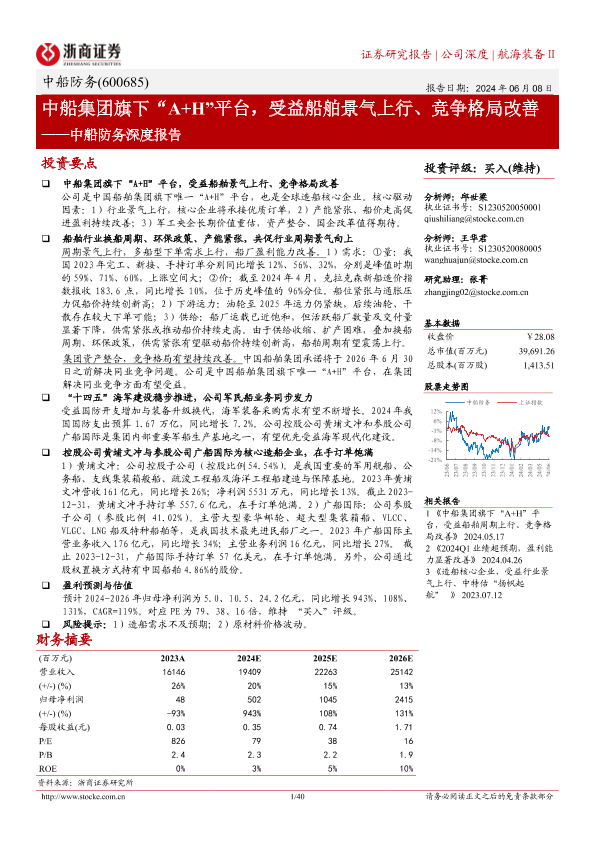 【浙商证券】【20240608】中船防务深度报告:中船集团旗下“A+H”平台,受益船舶景气上行、竞争格局改善-40页