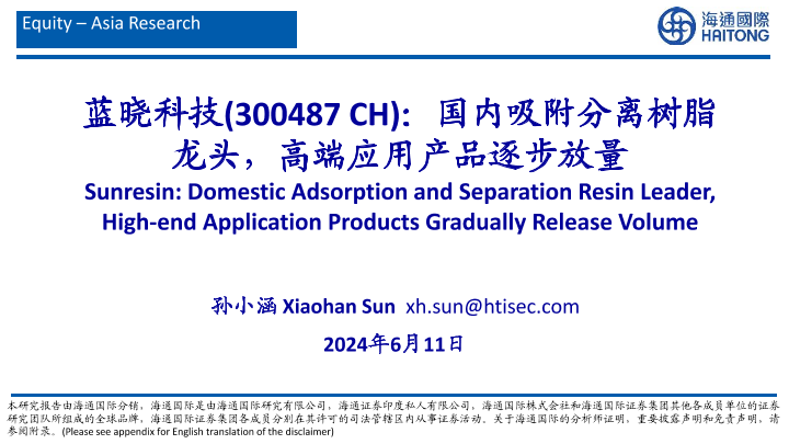 【海通国际】【20240611】蓝晓科技:国内吸附分离树脂龙头,高端应用产品逐步放量-55页