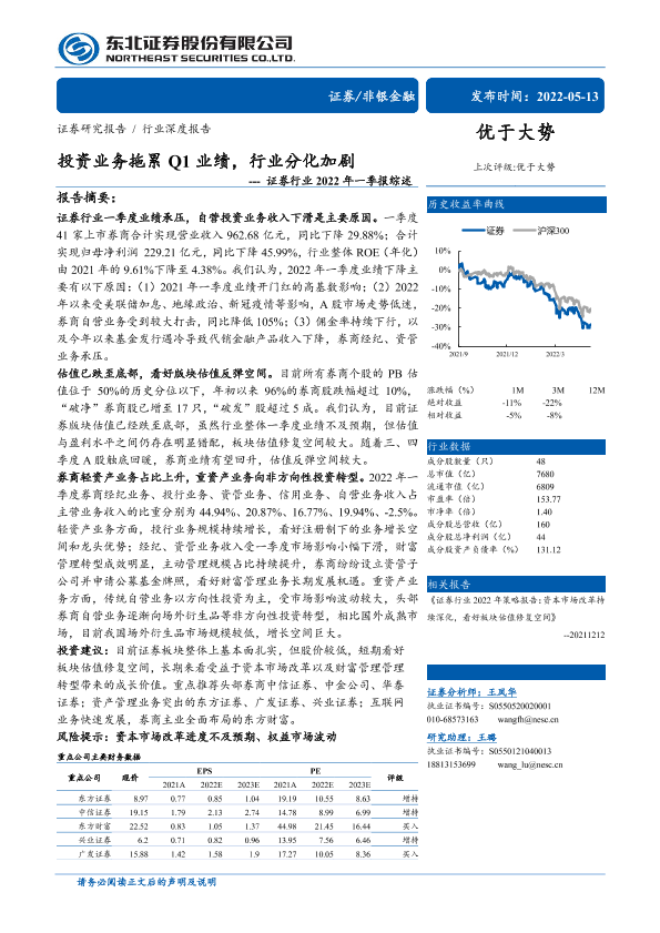 【东北证券】【20220513】证券行业2022年一季报综述:投资业务拖累Q1业绩,行业分化加剧-32页