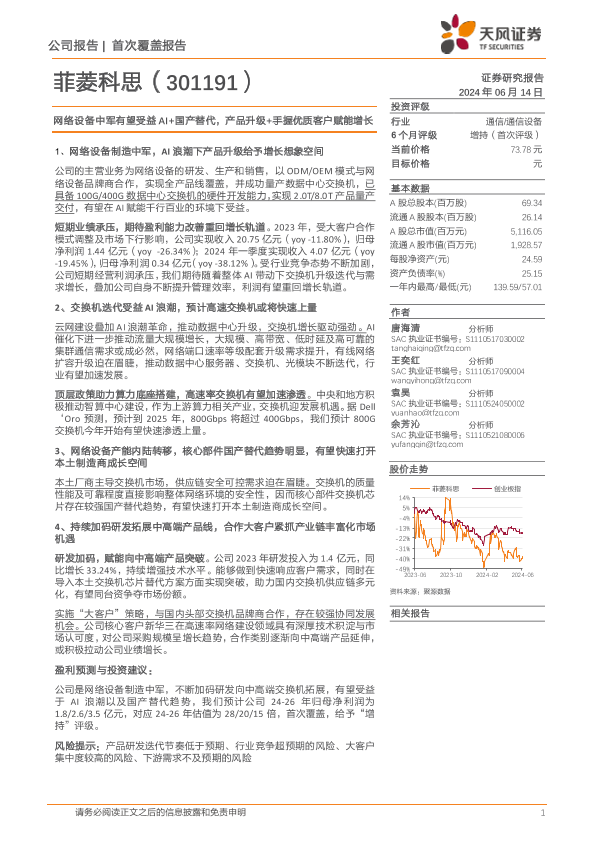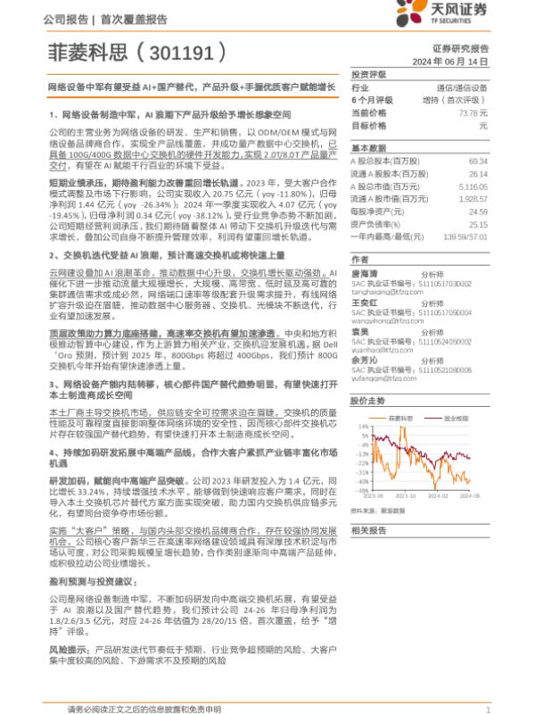 【天风证券】【20240614】菲菱科思-网络设备中军有望受益AI+国产替代,产品升级+手握优质客户赋能增长-29页