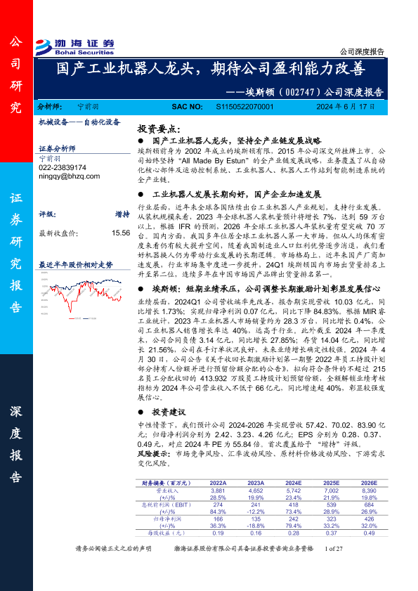 【渤海证券】【20240617】20240617-渤海证券-埃斯顿-002747.SZ-公司深度报告:国产工业机器人龙头,期待公司盈利能力改善-27页