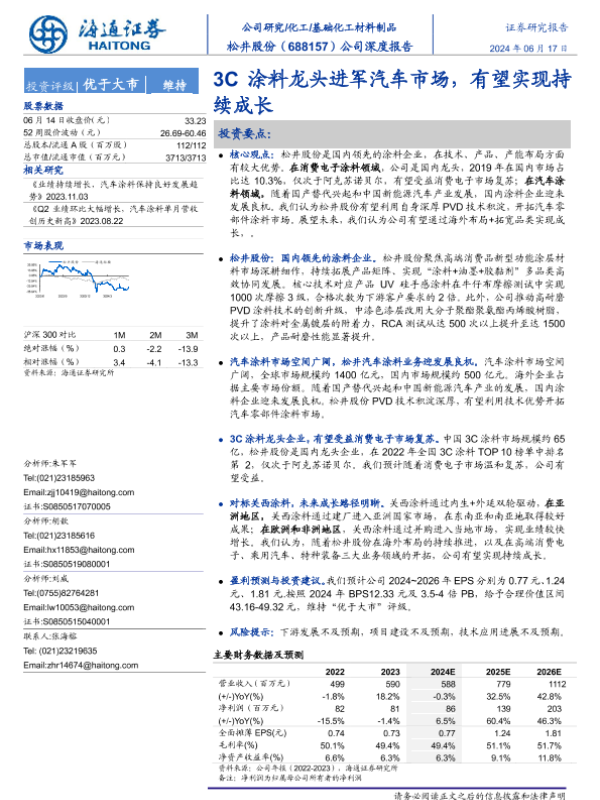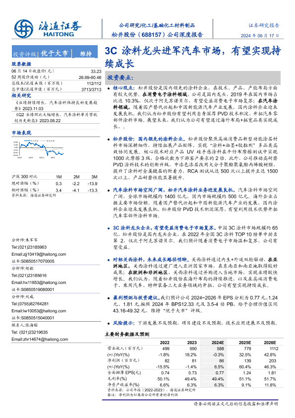 【海通证券】【20240617】20240617-海通证券-松井股份-688157.SH-公司深度报告:3C涂料龙头进军汽车市场,有望实现持续成长-26页