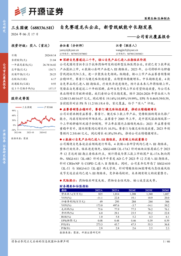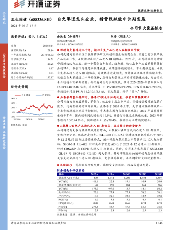【开源证券】【20240617】三生国健-公司首次覆盖报告:自免赛道龙头企业,新管线赋能中长期发展-46页