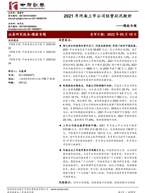 【中原证券】【20220518】豫股专题:2021年河南上市公司经营状况较好-22页