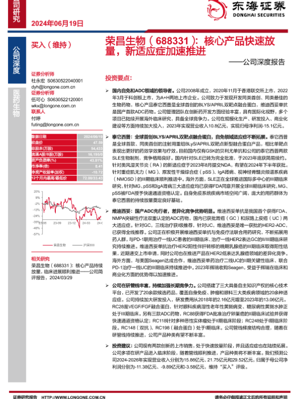 【东海证券】【20240619】荣昌生物(688331):核心产品快速放量,新适应症加速推进-41页