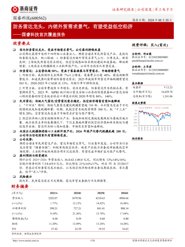 【浙商证券】【20240625】国睿科技首次覆盖报告:防务雷达龙头,内销外贸需求景气,有望受益低空经济-30页