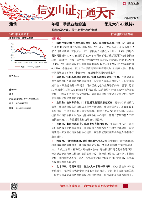 【山西证券】【20220513】通信行业年报一季报业绩综述:盈利状况改善,关注高景气细分领域-18页
