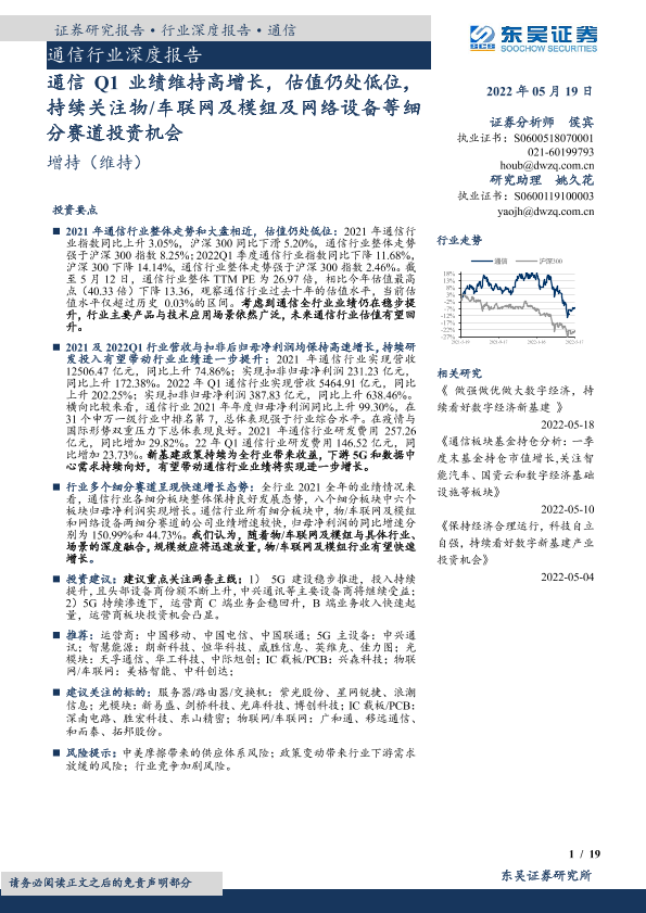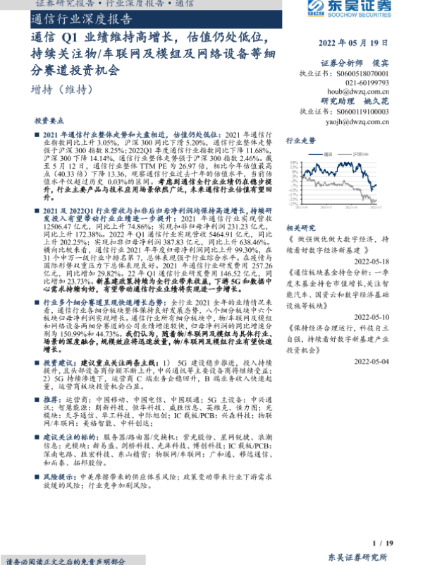 【东吴证券】【20220519】通信行业深度报告:通信Q1业绩维持高增长,估值仍处低位,持续关注物车联网及模组及网络设备等细分赛道投资机会-19页