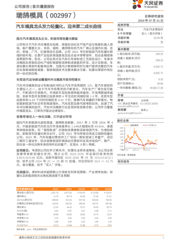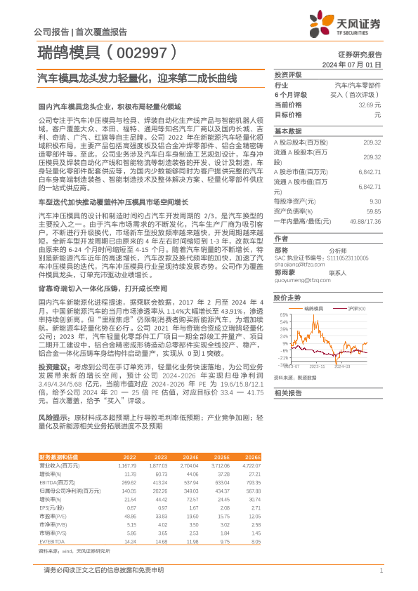 【天风证券】【20240701】瑞鹄模具-002997.SZ-汽车模具龙头发力轻量化,迎来第二成长曲线-28页