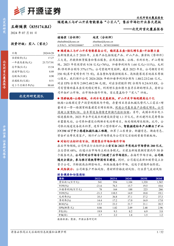 【开源证券】【20240701】北交所首次覆盖报告:隧道施工与矿山开采智能装备“小巨人”,售后市场打开业务天花板-52页