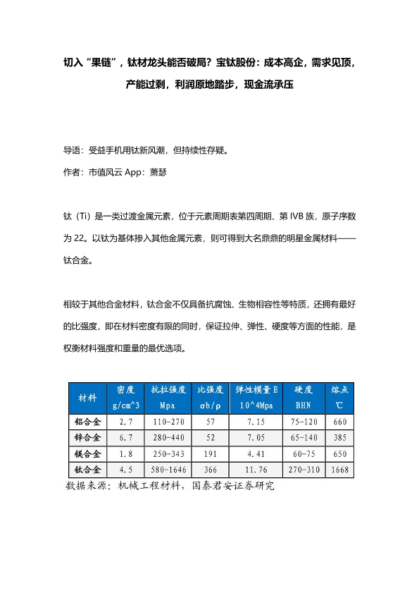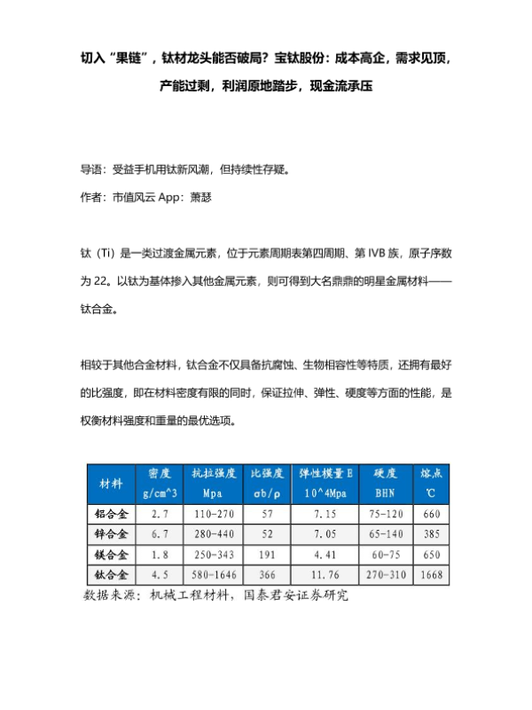 【市值风云】【202404】切入“果链”,钛材龙头能否破局?宝钛股份:成本高企,需求见顶,产能过剩,利润原地踏步,现金流承压-23页