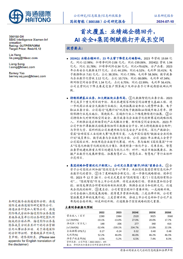 【海通国际】【20240710】国投智能-300188.SZ-首次覆盖:业绩端企稳回升,AI安全+集团侧赋能打开成长空间-13页