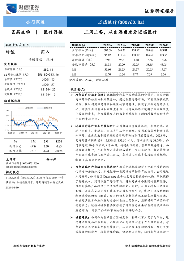 医疗器械 国际化战略 海外市场 财务预测 迈瑞医疗