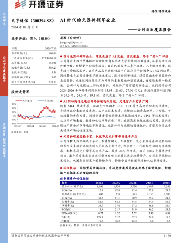 【开源证券】【20240711】天孚通信-公司首次覆盖报告:AI时代的光器件领军企业-30页