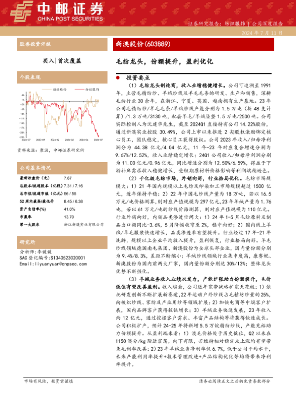【中邮证券】【20240711】新澳股份-603889.SH-毛纺龙头,份额提升,盈利优化-33页