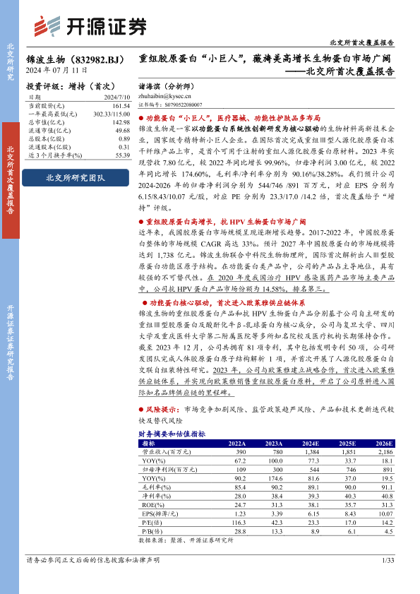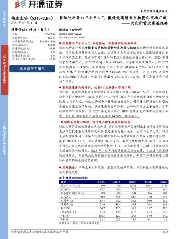 【开源证券】【20240711】北交所首次覆盖报告:重组胶原蛋白“小巨人”,薇旖美高增长生物蛋白市场广阔-33页