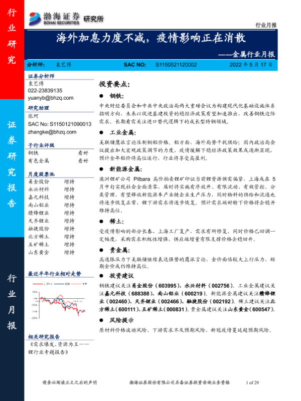 【渤海证券】【20220517】金属行业月报:海外加息力度不减,疫情影响正在消散-29页