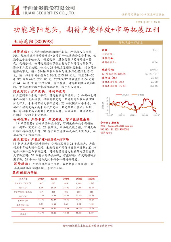 产能释放 功能遮阳 市场拓展 玉马遮阳 证券分析