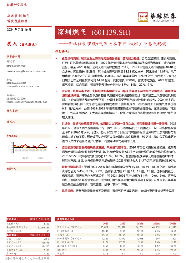 【华源证券】【20240716】20240716-华源证券-深圳燃气-601139.SH-价格机制理顺+气源成本下行 城燃主业愈发稳健-19页